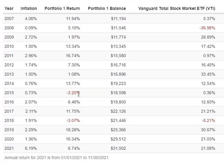 Nella tabella che segue mostriamo i rendimenti anno per anno dei due asset in un confronto che non lascia spazio a dubbi: è meglio l’All Weather Portfolio soprattutto in termini di riduzione del rischio a parità di rendimento.